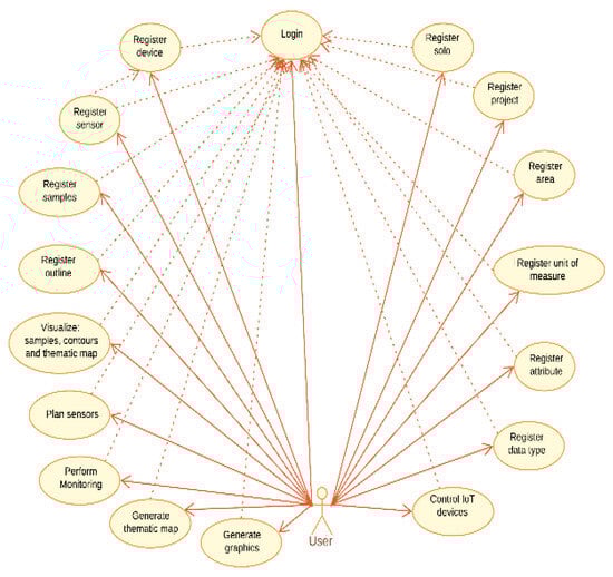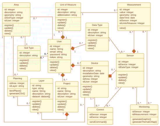 The web application is structured into three modules: Planning, Monitoring, and Control. UML diagrams were created to plan the system’s structure and functionalities. The class diagram (Figure 3) illustrates the application’s structure and the relationships between its entities, with the User class at its center. The use case diagram (Figure 4) illustrates user interactions, including logging in, data entry, and device management.
