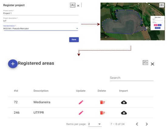 User interaction begins with login and project selection or creation. Within a project, users can register and manage areas, soil samples, and IoT devices (Figure 7). The application requires users to have prior knowledge of registration procedures, as it does not provide predefined lists of soil types or units of measurement. For spatial data, the application automatically converts coordinate DATUMs if necessary, though using a UTM DATUM is recommended for optimal performance.