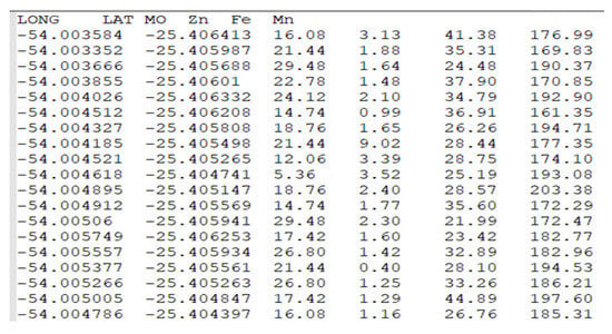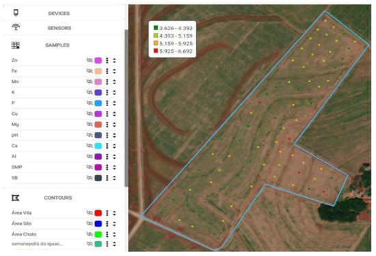 Soil samples can be registered by importing CSV or TXT files (Figure 8), which must contain geographic coordinates and at least one soil attribute (Figure 9). The application supports data visualization on an interactive map (Figure 10), allowing users to overlay fields, samples, thematic maps, and devices. A limitation is that the API does not store the data measurement scale, so it cannot be displayed in the legend.