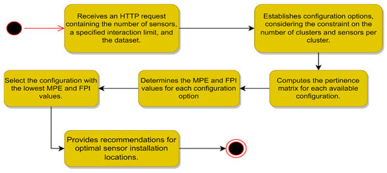 The API Sensor Position implements the modified Fuzzy C-Means method [28]. Its workflow (Figure 11) involves generating a limited number of random point combinations based on the desired number of sensors and an iteration limit. For each combination, it calculates the membership matrix, FPI, and MPE. The combination with the lowest FPI and MPE values is selected, and its points are returned as suggested sensor locations. The execution time depends on the dataset size, number of sensors, and iteration limit.