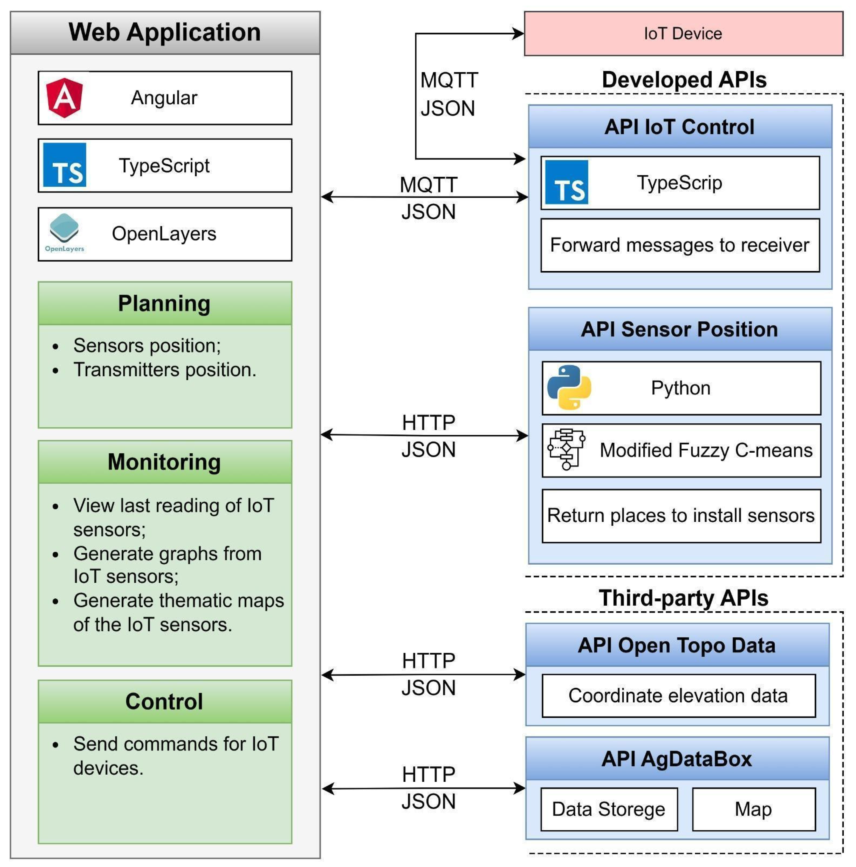 16], for generating thematic maps; and modules for interpolator selection, fertilizer and limestone recommendation, ADB-AplicNutrient; variable selection and management zone definition; data cleansing, ADB-Cleaning; and satellite image and UAV geoprocessing, ADB-RS. However, a dedicated, configurable IoT environment for sensor network planning, data acquisition, and device control was missing from this suite. This study aims to address this gap by developing and integrating the ADB-IOT module into the ADB platform. The primary objectives were to (1) design and implement a web application for IoT network planning, (2) enable real-time data monitoring and visualization, and (3) provide remote control capabilities for IoT devices within a unified, user-friendly interface.