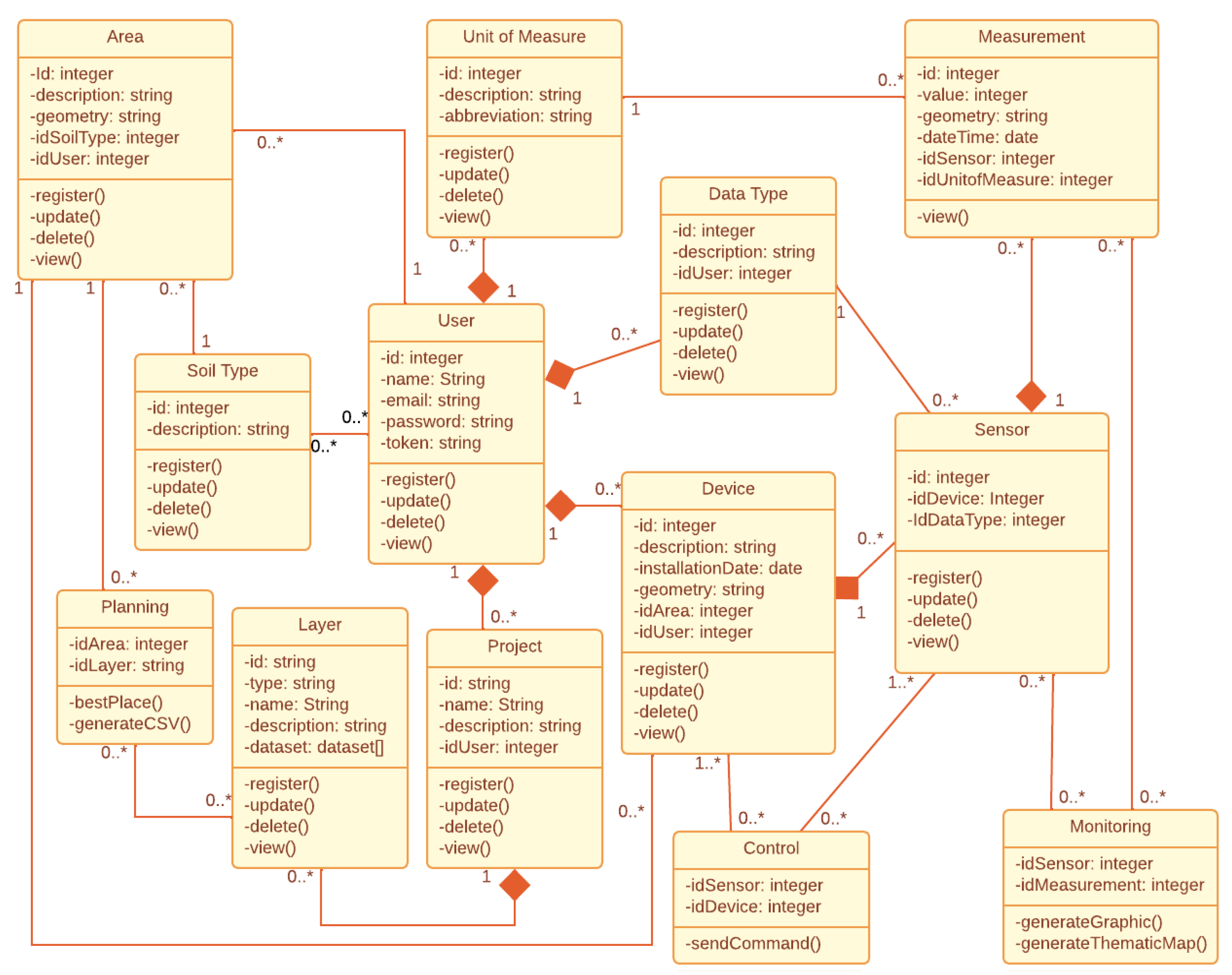 The web application is structured into three modules: Planning, Monitoring, and Control. UML diagrams were created to plan the system’s structure and functionalities. The class diagram (