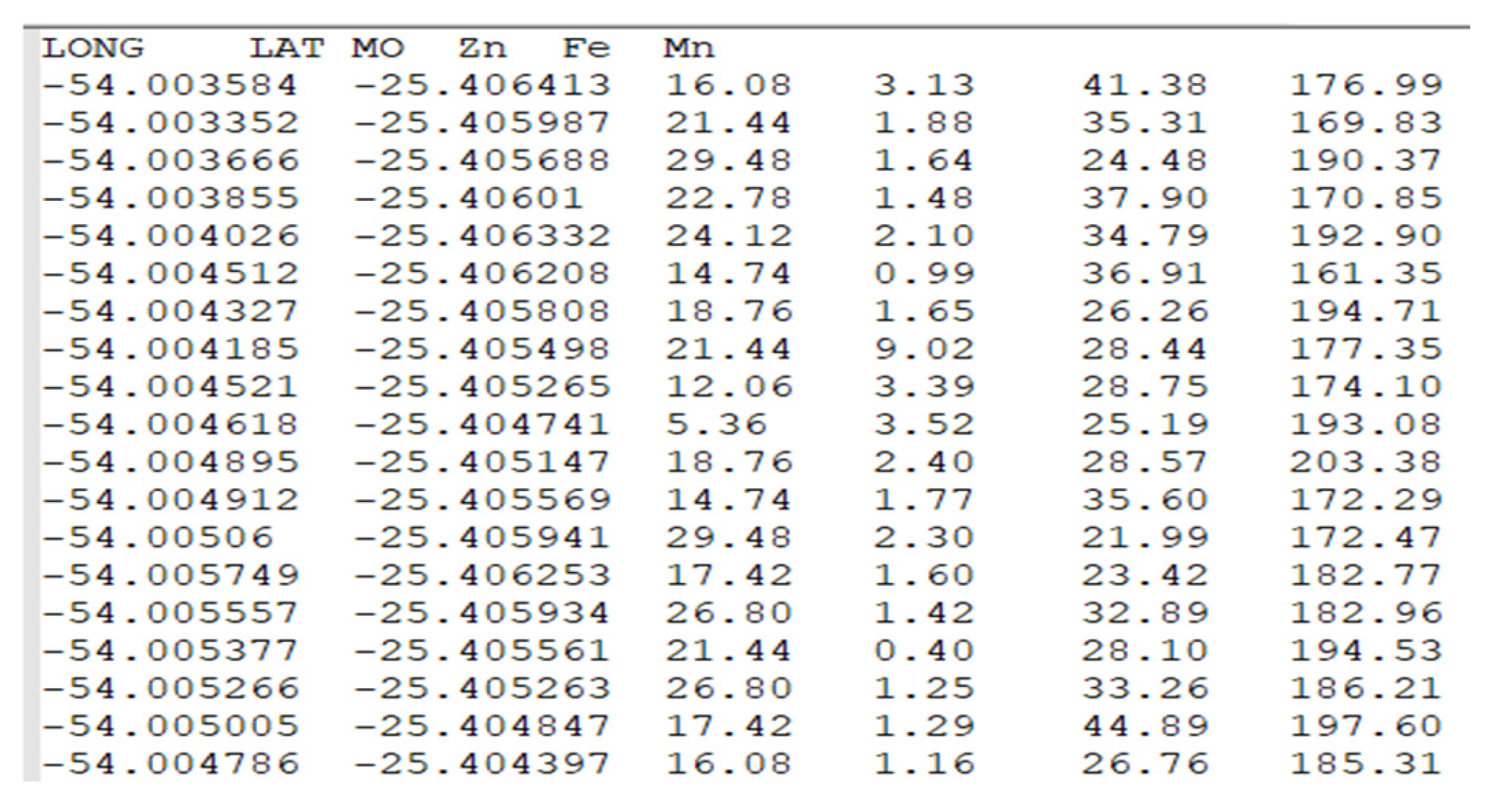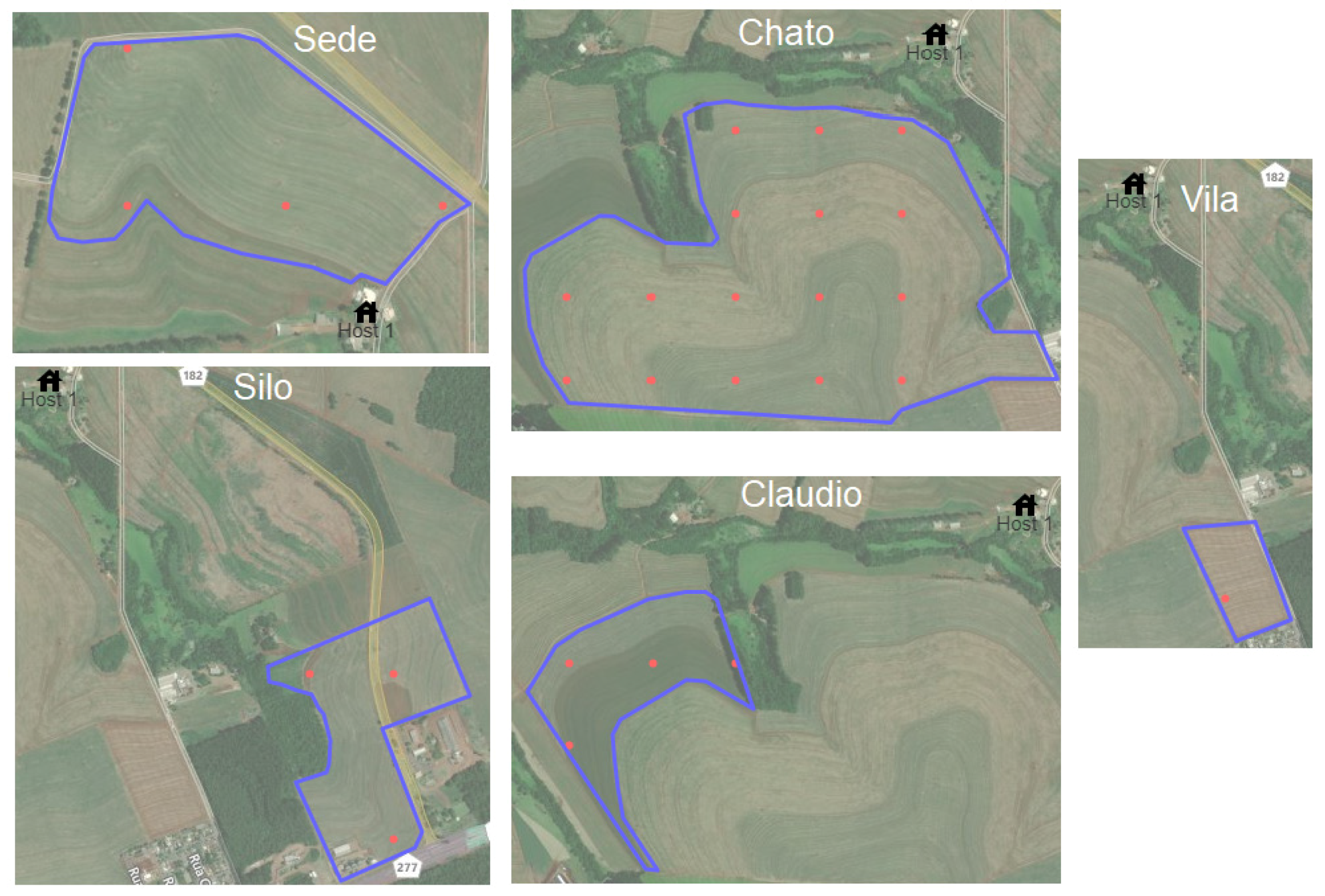 To validate the computational module, an experimental area located in Céu Azul, Paraná, Brazil, at the geographic center, with coordinates (25°06′32″ S and 53°49′55″ W) and an altitude of 460 m, was used. The experimental area consists of five regions (Sede–32.2 ha, Silo–28.9 ha, Chato–121 ha, Vila–7.66 ha, and Claudio–23.8 ha) (