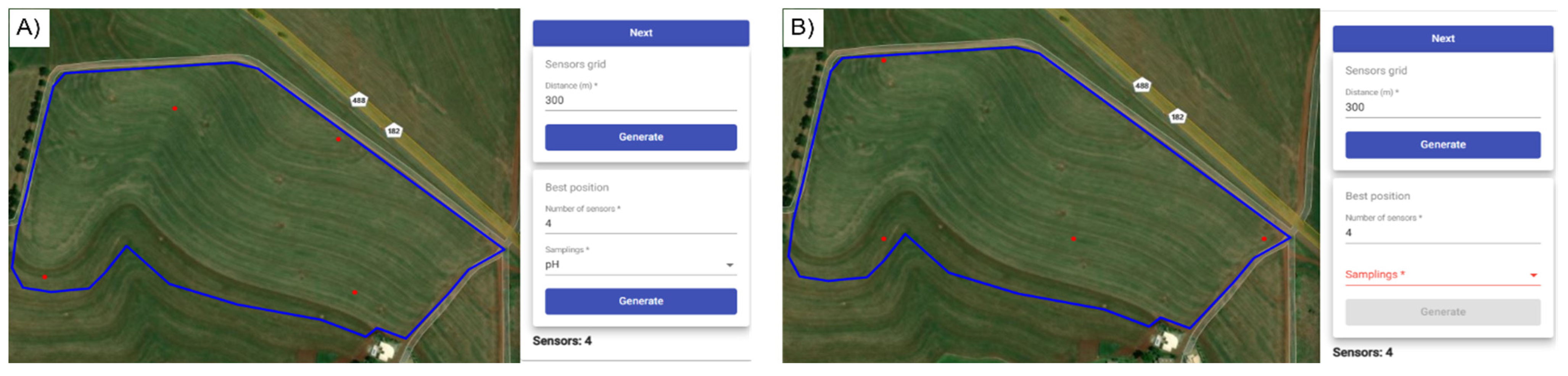 Sensor Planning: Offers three tools: (1) Manual mode for placing sensors on a map; (2) Point grid for generating a regular grid based on a user-specified distance; and (3) Best installation locations, which uses the Sensor Position API to analyze soil sample data and suggest optimal positions.
