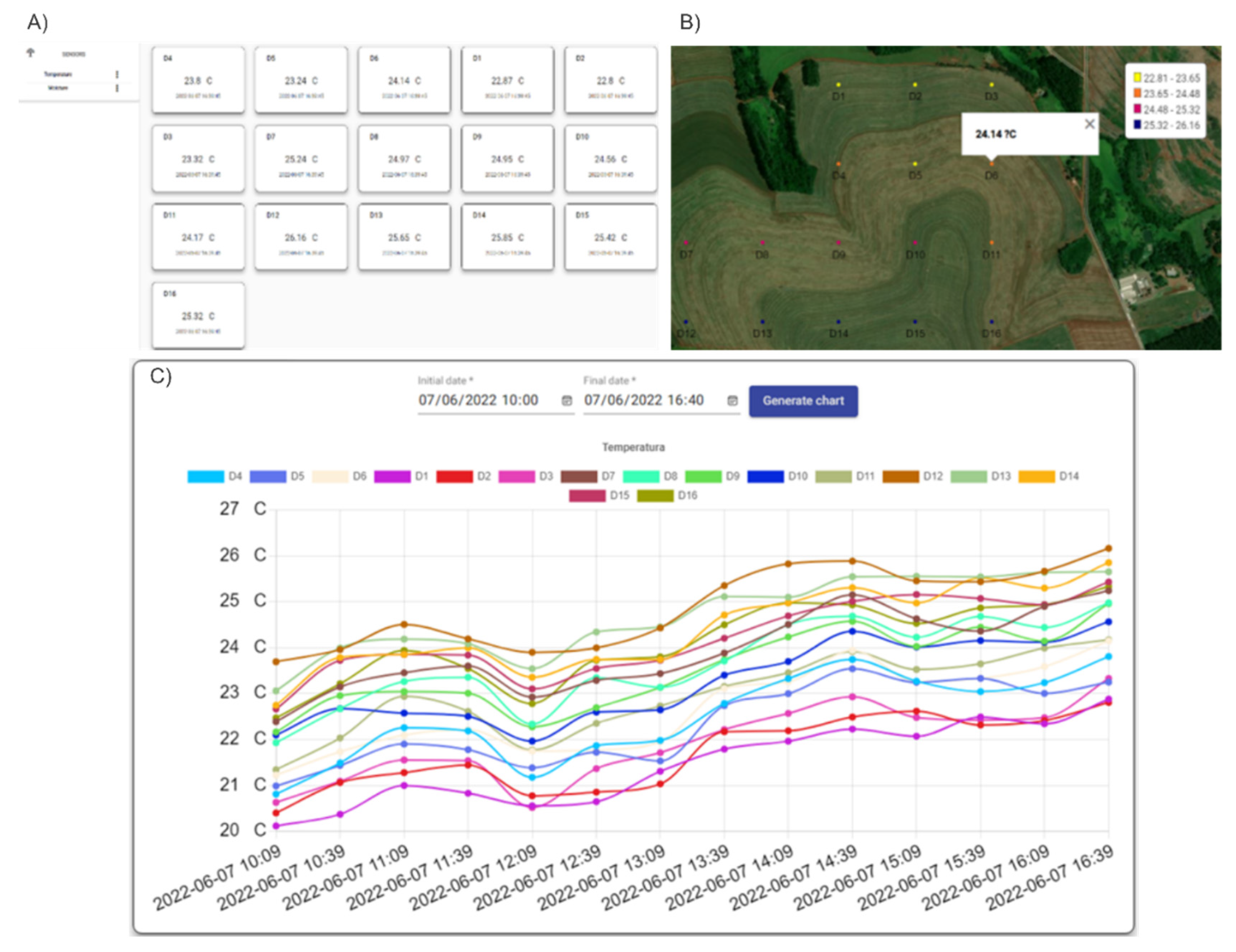 Presentation of the latest temperature sensor readings (A), presentation of the latest readings for temperature sensors on a map (B), and data collected (C) from agrometeorological stations (Kate 3.0) installed in the study area. *—required.