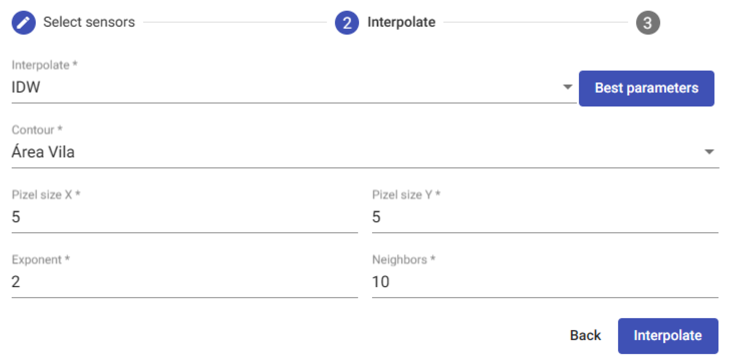 Second stage of thematic map generation: Definition of interpolator, area outline, and interpolation parameters. *—required.