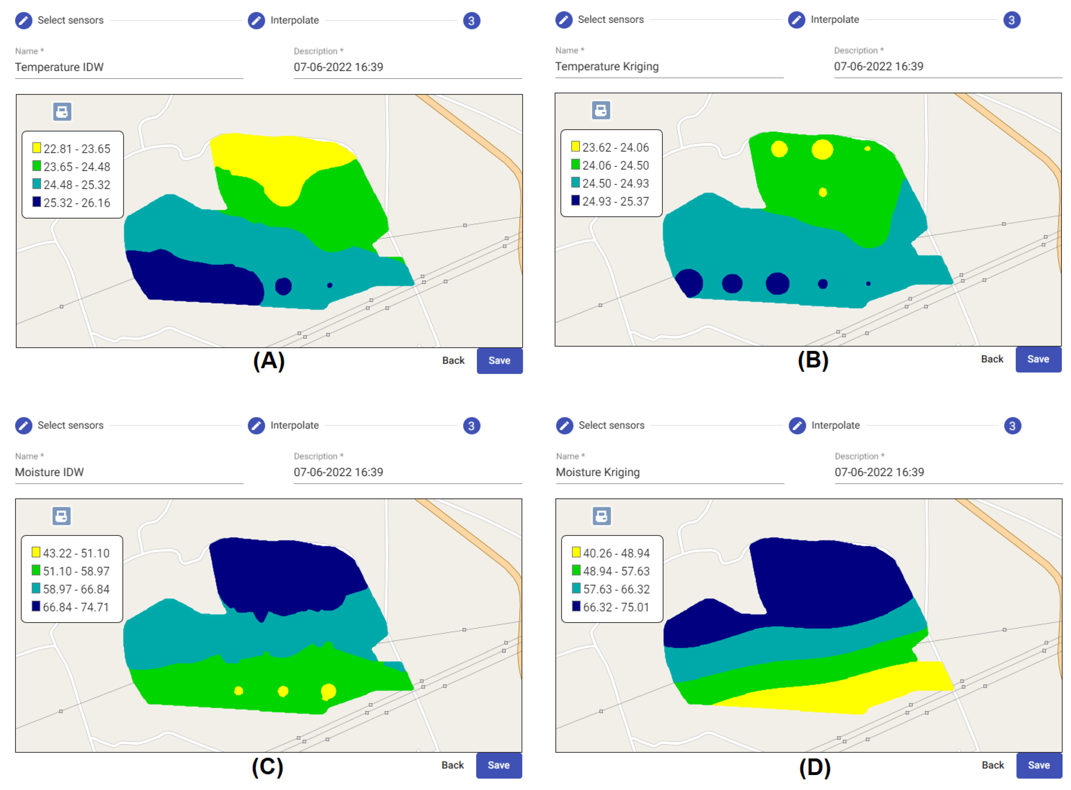 This text depicts the third stage of generating a thematic map based on data from the agrometeorological station Kate 3.0: Presentation of the thematic map, (A) temperature map by IDW interpolator, (B) temperature map by Ordinary Kriging interpolator, (C) moisture map by IDW interpolator, and (D) moisture map by Ordinary Kriging interpolator. *—required.