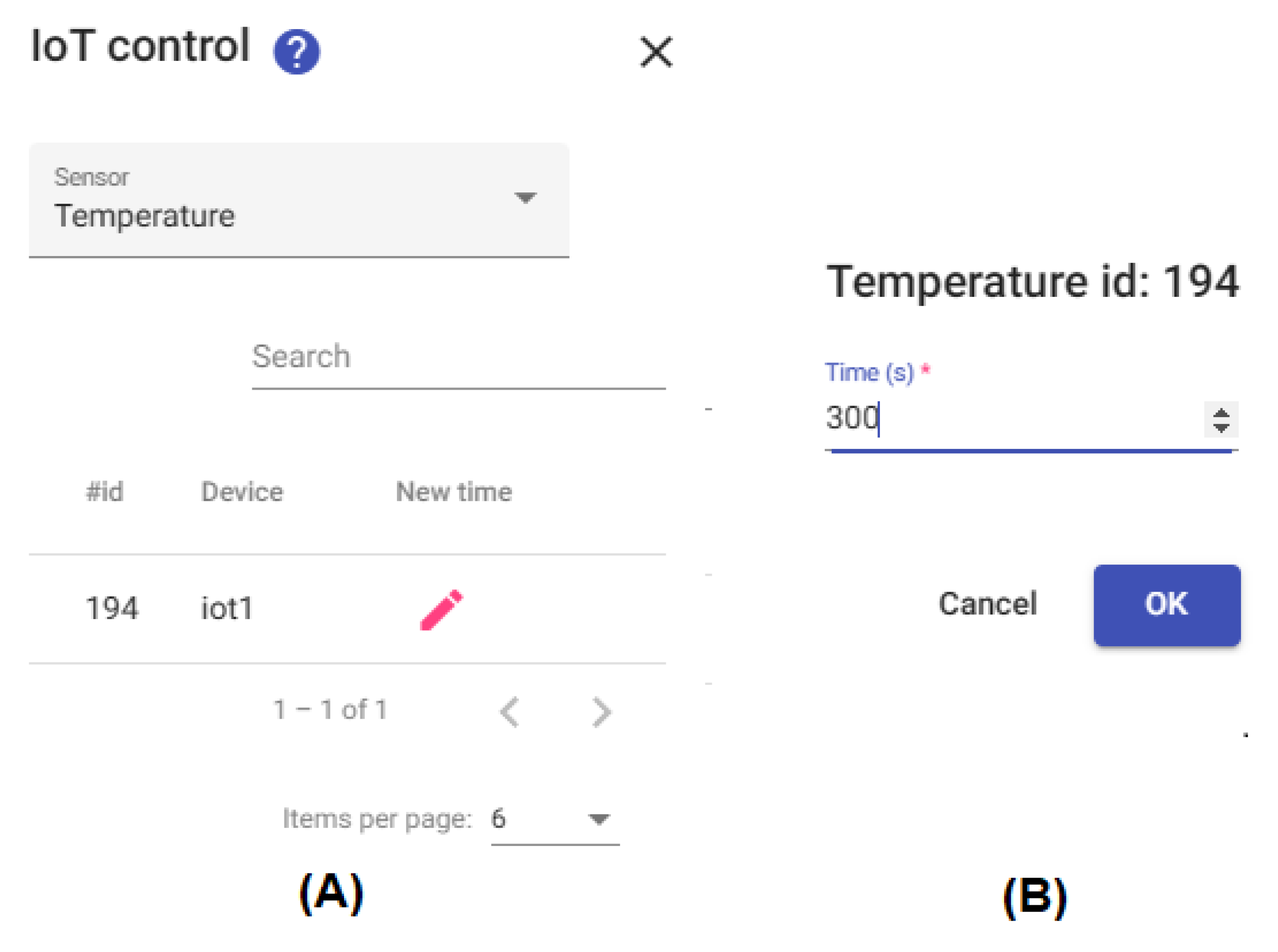 Control module screen for sensors (A) and the screen to set the new data transmission interval for a sensor (B). *—required.