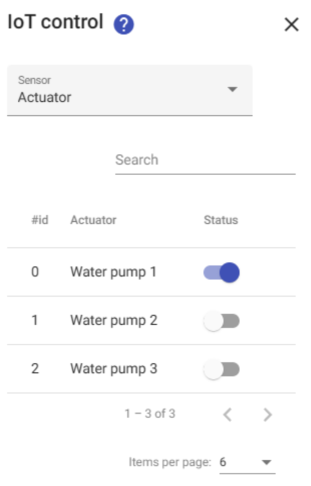 This module allows the web application to send commands to field devices via the IoT Control API. Commands include turning actuators on/off or changing the data transmission interval of sensors.