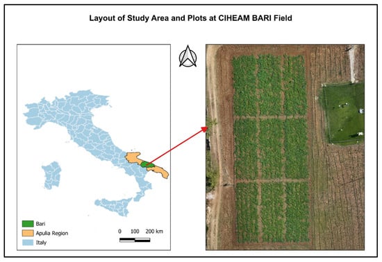 The experiment was conducted during the May–August 2025 growing season in an open field in the experimental field of the Mediterranean Agronomic Institute of Bari, located in the Apulia region of southern Italy (Figure 1). The study area is located at 41°03′16″ N and 16°52′32″ E, at an elevation of 77 m above sea level. The field covers a total surface area of 1408 m2 (0.14 ha).
