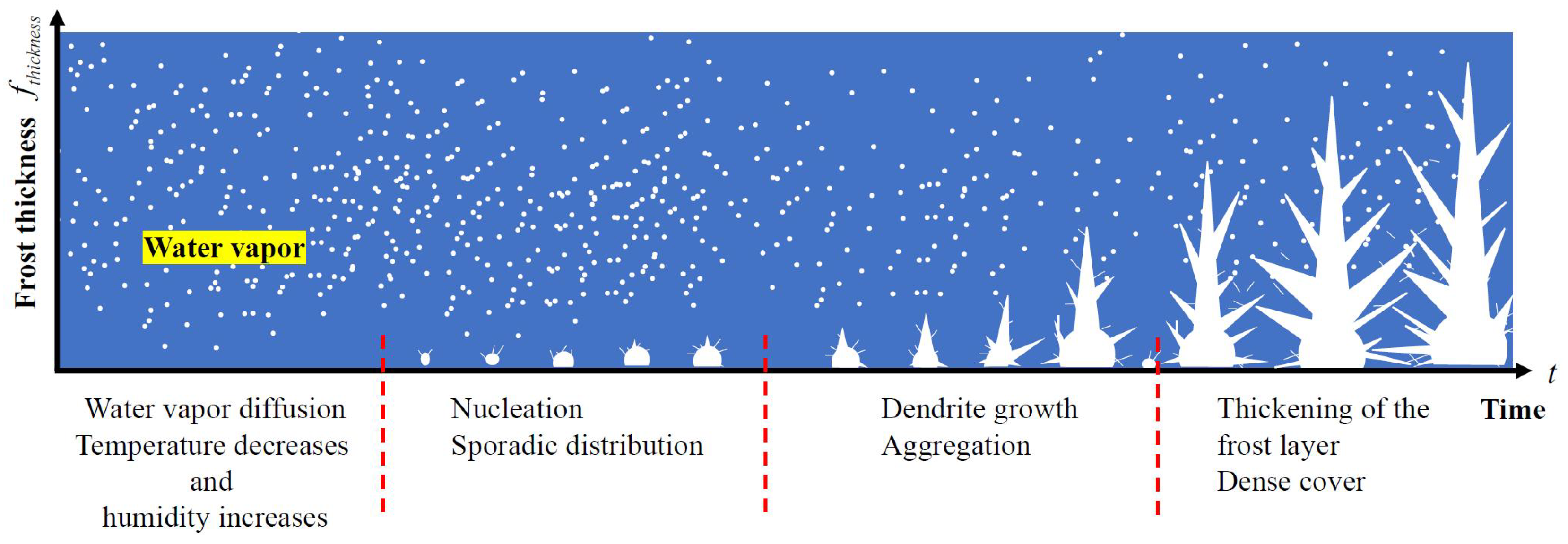 - Qiu, G.; Li, S.; Shi, Y.; Fang, X.; Cai, W. Development and validation of a numerical model for frost growth based on nucleation theory. Int. J. Heat Mass Transf. 2024, 221, 125137. [Google Scholar] [CrossRef]