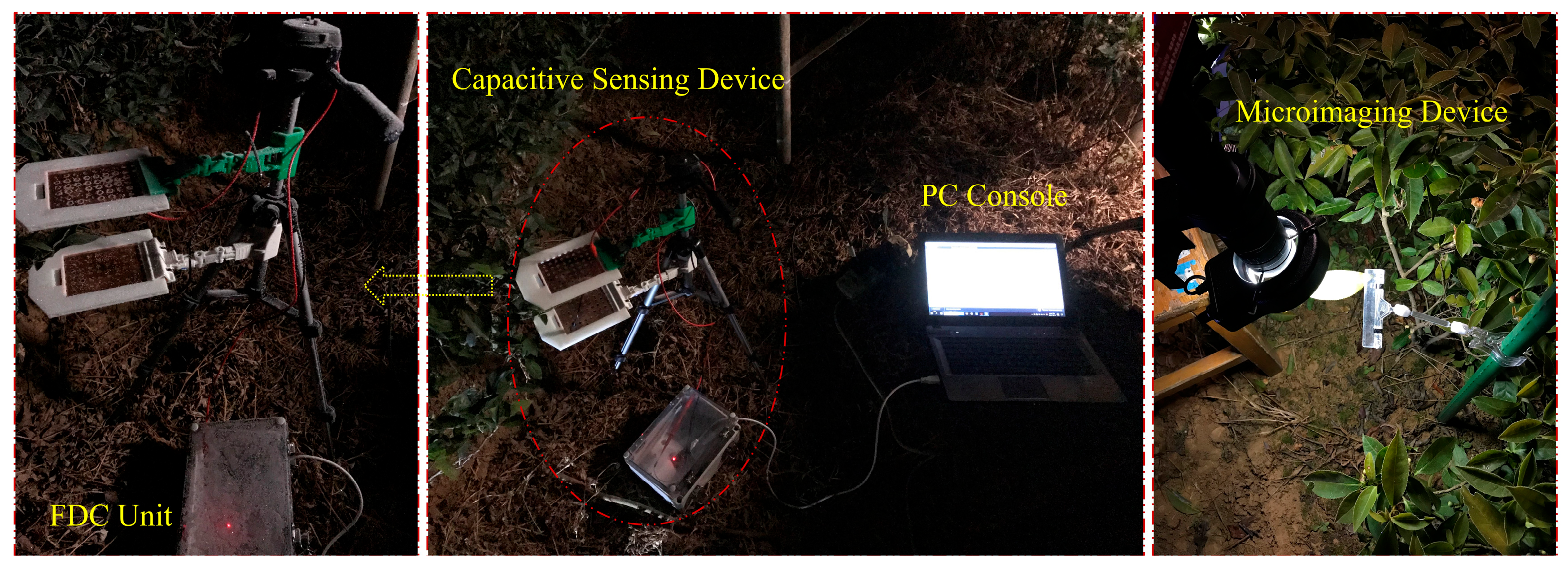 - An industrial microscope camera equipped with a ring LED fill light (Ningbo Weifeng Equipment Group Co., Ltd., Ningbo, Zhejiang, China) was fixed beside the capacitive sensor (Jiangsu University, Zhenjiang, Jiangsu, China). Synchronized with the weighing, a high-resolution (5-megapixel) microscopic image of the leaf surface was automatically captured every hour.