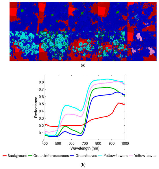 Figure 4a shows the hyperspectral mosaic that constitutes the training dataset (the corresponding source images are shown in Figure 3a), comprising a total of 2,621,440 pixels, divided into components as follows: 641,249 pixels of the Background class; 75,062 pixels of the Green inflorescences; 1,630,375 pixels of the Green leaves; 245,729 pixels of the Yellow flowers class; 29,025 pixels of the Yellow leaves class. Figure 4b shows the corresponding average raw reflectance spectra. Figure 4c,d display the PCA score and loading plots, which are useful for exploring spectral variability among the classes studied. As shown in Figure 4b, the VIS-NIR range offers key spectral information for characterizing the target plant structures. The background class, representing a combination of non-target elements such as shadows, soil, and the white reference panel, exhibited a spectral signature with no marked features and only a modest increase in reflectance approaching 900 nm. Both green inflorescences and green leaves displayed reflectance minima around 450 nm and 680 nm, corresponding to chlorophyll absorption, followed by a sharp red-edge transition between 680 nm and 750 nm and a high NIR plateau from 750 nm to 900 nm [56,57]. Green leaves maintained stable reflectance values beyond 900 nm. Meanwhile, green inflorescences showed slightly higher overall reflectance but a decline after 900 nm, a pattern attributed to reduced intercellular spaces compared with leaf mesophyll, which decreases multiple scattering [58]. This structural compactness of sepal tissues, closer to stem-like morphology than to leaf mesophyll, likely explains the lower near-infrared scattering and provides the spectral basis to distinguish green inflorescences from green leaves despite their similar chlorophyll content. The yellow flowers’ spectrum was characterized by reduced absorption in the red region, consistent with the absence of chlorophyll and a broad absorption in the blue–green region (around 450–480 nm) associated with carotenoids, which dominate the spectral signature of yellow petals [59,60,61]. Yellow leaves, in contrast, showed spectral features linked to chlorophyll breakdown, cell wall collapse, and reduced water content, resulting in lower near-infrared reflectance and a slight blue shift in the red edge compared with yellow flowers [62,63].