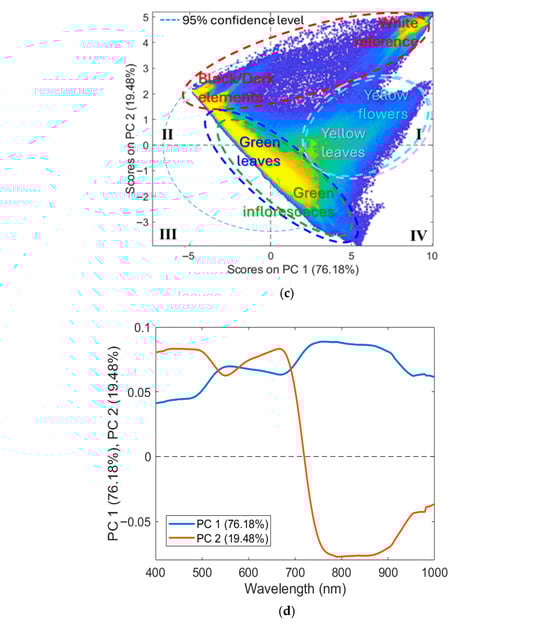 The PCA score plot (Figure 4c) showed that most of the variance was captured by the first two PCs, where PC1 and PC2 explained 76.18% and 19.48% of the total variance, respectively. The score plot revealed a clear separation between three main clusters: (i) background; (ii) green inflorescence + green leaves; (iii) yellow flowers + yellow leaves. Furthermore, the background class formed two distinct clusters: (i) white reference mainly distributed in the first (I) quadrant; (ii) dark background elements (e.g., shadows and soil) mainly concentrated in the second (II) quadrant. Green inflorescences and green leaves classes were mostly located in the central region of the plot, spanning the second (II), third (III), and fourth (IV) quadrants. Yellow flowers and yellow leaves classes were mainly positioned between the first (I) and fourth (IV) quadrants.