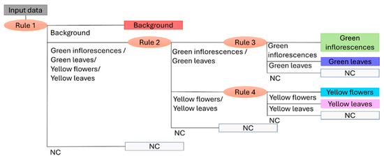 The sequence of decision rules reflects the progressive spectral separability observed with PCA, where an initial separation distinguished background from plant structures (Rule 1), followed by a discrimination between green and yellow tissues (Rule 2). At deeper levels of the hierarchy, increasingly spectrally similar subclasses were resolved, first separating green inflorescences from green leaves (Rule 3) and then yellow flowers from yellow leaves (Rule 4).