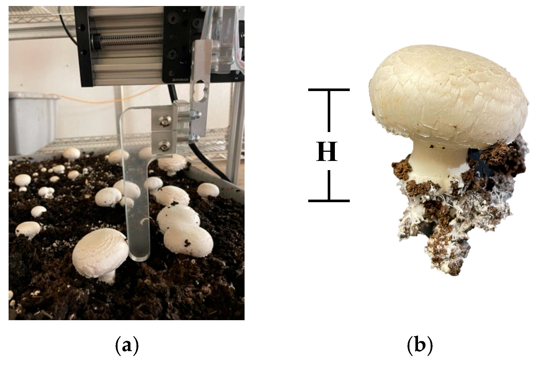 - Noble, R.; Reed, J.N.; Miles, S.; Jackson, A.F.; Butler, J. Influence of Mushroom Strains and Population Density on the Performance of a Robotic Harvester. J. Agric. Eng. Res. 1997, 68, 215–222. [Google Scholar] [CrossRef]