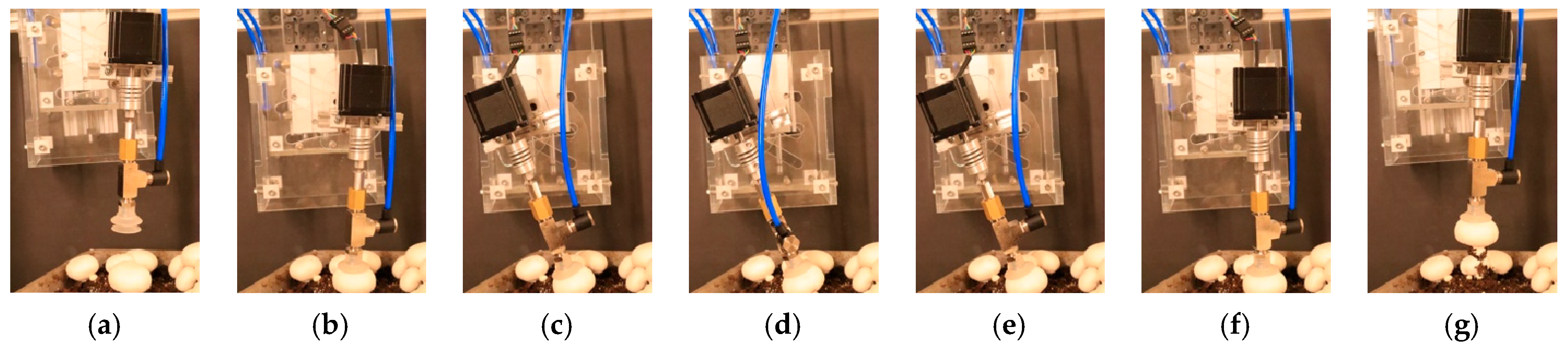 - Zhao, K.; Li, H.; Ji, J.; Li, Q.; Li, M.; He, Y.; Li, J.; Xing, S. Pressure-Stabilized Flexible End-Effector for Selective Picking of Agaricus bisporus. Agriculture 2023, 13, 2256. [Google Scholar] [CrossRef]