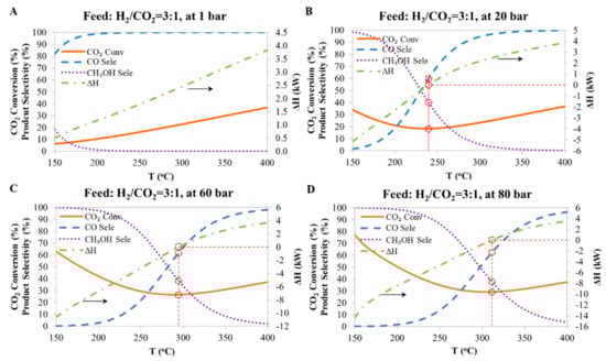 The predicted CO2 conversion, product selectivity and the change in the overall enthalpy of the reaction at equilibrium as a function of reaction conditions for methanol synthesis system. A: at 1 bar; B: at 20 bar; C: at 60 bar; D: at 80 bar.