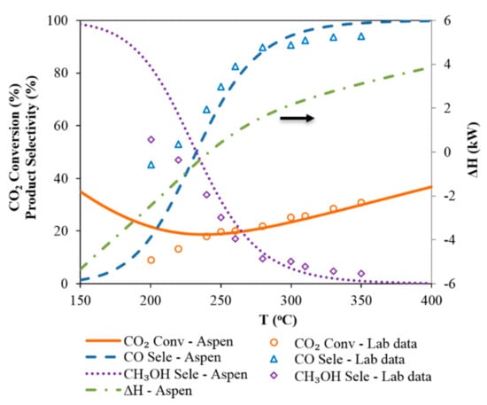 Figure 4 compares the results from the experiments and those predicted by the Aspen simulation. The experimental and simulation results compare well from a temperature above 240 °C, suggesting that equilibrium was reached in the experiments run at this temperature or higher. Therefore, a thermodynamic model based on equilibrium can be used to predict the behavior of the Cu-reactor at pressures which were not covered in these experiments; from the results (Figure 3), it can be concluded that methanol formation from CO2 is thermodynamically favored at low temperature and high pressure, whereas CO formation is favored at high temperature. It can also be seen that CO formation decreases with increasing pressure; however, this is due to the increase in methanol selectivity, rather than the increase in pressure, since the R-WGS reaction is not affected by pressure. Daza and Kuhn [] also mentioned that the R-WGS reaction is equilibrium limited, and its conversion is affected by temperature as it is an endothermic reaction, rather than by pressure due to the stoichiometry of the reaction.