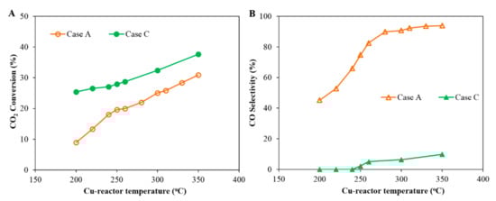 Comparison of the CO2 conversion and CO selectivity as a function of the Cu-reactor temperature in Case A and Case C: (1) Case A: CO2 hydrogenation over a Cu-based catalyst. Reaction conditions: pressure 20 bar (gauge), flow rate 60 mL (NTP)/(min·gcat) of feed gas H2/CO2/N2 = 67.6%/22.6%/9.8%, and (2) Case C: CO2 hydrogenation in a Cu-reactor and Co-reactor in series. Reaction conditions: the first reactor was loaded with a Cu-based catalyst under the following conditions: pressure 20 bar (gauge), flow rate 60 mL (NTP)/(min·gcat) of feed gas H2/CO2/N2 = 67.6%/22.6%/9.8%; the second reactor was loaded with a Co-based catalyst and received the tail gas from the first reactor at a reaction temperature of 200 °C. (A) CO2 conversion and (B) CO selectivity.