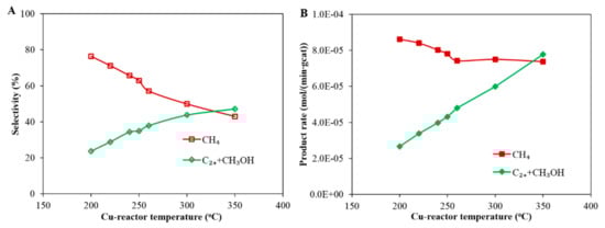 The overall product selectivity and formation rates as a function of temperature of the Cu-reactor are shown in Figure 6. Note that the temperature of Cu-reactor was gradually increased from 200 to 350 °C, while the Co-reactor was maintained at 200 °C. The results in Figure 6A show that CH4 selectivity decreases with increasing operating temperature of the Cu-reactor, while the selectivity of the desired products (methanol + C2+) increases. A similar trend is observed when looking at the reaction rate in Figure 6B where the rate of formation of desired products (methanol + C2+) increases with increasing temperature of the Cu-reactor while the rate of formation of CH4 decreases from 8.6 × 10−5 mol/(min·gcat) to 7.4 × 10−5 mol/(min·gcat), as the temperature of Cu-reactor increases from 200 to about 250 °C and then remains fairly constant as the temperature increases further.