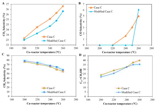 Figure 5 shows the comparison of the CO2 conversion between Case A and Case C as a function of temperature, where temperature is varied in the Cu-reactor only while the Co-reactor temperature is kept constant. It is clear that total CO2 conversion increases with temperature in both cases and that the conversion in Case C is greater than that of Case A, due to the added reactor in Case C. The comparison of the CO selectivity for both Case A and Case B is shown in Figure 5B. No CO could be detected in the exit from the FT reactor when the temperature of the Cu-reactor was below 250 °C. It is worth noting that the CO selectivity in Case C is much lower than that of Case A, which indicates that the undesirable CO produced in the Cu-reactor was reacted in the Co-reactor (the second reactor in Case C) to valuable hydrocarbon products.