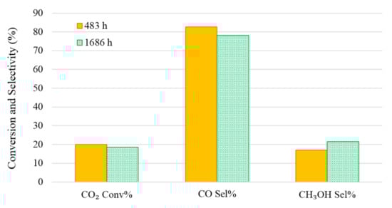 Cu-based catalyst stability testing. Reaction conditions: temperature 260 °C, pressure 20 bar (gauge), flow rate 60 mL (NTP)/(min·gcat) and feed gas H2/CO2/N2 = 67.6%/22.6%/9.8%.