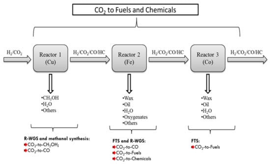 CO2 hydrogenation to methanol and hydrocarbon fuels over their respective appropriate catalysts has been shown to be feasible, but it comes with some important limitations and undesirable by-products. However, in their recent work, Sempuga and Yao [] have demonstrated the potential benefits of co-production of chemicals by CO2 hydrogenation; the work looked at a number of CO2 hydrogenation processes and showed that all of them are potentially inefficient in conserving the chemical potential of hydrogen in their final respective products. Co-production of chemicals seemed to be the only way that can fully conserve the chemical potential of hydrogen and can minimize heat duty requirements, thereby potentially leading to lower capital and operating costs. One of the ways of doing this is to couple methanol synthesis with Fischer–Tropsch synthesis (FTS) in series, where CO2 and the byproduct, CO, from the R-WGS reaction occurring during methanol synthesis are converted to useful chemicals and transport fuels in downstream FT synthesis sections.