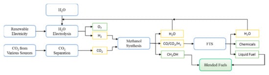 Concerns over global warming have led to the search for ways of safe CO2 disposal; CO2 hydrogenation could be one of the solutions as it would act as a CO2 re-use and thereby reduce net CO2 production []. However this requires an environmental friendly source of H2, which will not produce more CO2, such as hydro, solar, or nuclear energy [,,]. If we assume that these sources of hydrogen are available, a greener process can be proposed as shown in Figure 11, in which the methanol synthesis and FTS are combined to convert CO2 to chemicals and hydrocarbons. The proposed process is much more flexible and controls the yields of methanol and hydrocarbon products by changing the operating conditions. The water produced in each section of the process can be recycled to produce H2 to be used in the process (via electrolysis using renewable sources of energy suggested above). The diesel fuels and methanol produced from this process could be blended together with different proportions, which will reduce the greenhouse emission with zero aromatic, nitrogen and sulfur components.