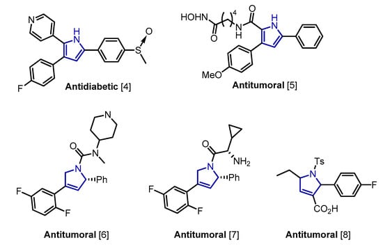 Both pyrrole and pyrroline are five-membered nitrogen-containing heterocycles, representing an important class of the privileged scaffolds occurring in nature [,,] and pharmaceuticals [,,,,]. A few examples of their biological activity are shown in Figure 1. Although the synthetic methods leading to pyrrole and/or pyrroline rings are well-documented, there is still a demand for developing new approaches for highly substituted and functionalized compounds.