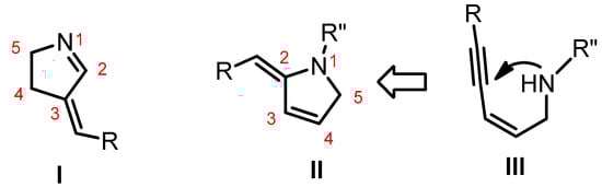 In this context, 3-ylidene-1-pyrrolines (I) have received much attention, because of the presence of an exocyclic double bond, a reactive imine bond and a nucleophilic nitrogen site on the ring []. Thus, various transformations of these compounds leading to pyrrole derivatives have been disclosed. On the other hand, 2-ylidene-3-pyrrolines (II), isomeric structures of I (when R” = H), are less explored [,,]. Quite a few reports show that 2-ylidene-3-pyrrolines are reactive intermediates and undergo aromatization upon heating to render the corresponding pyrroles []. In this work, we would like to investigate the possibility of the cyclization of (Z)-2-en-4-yn-1-amines (III) to give 2-ylidene-3-pyrroline and then their further transformation.