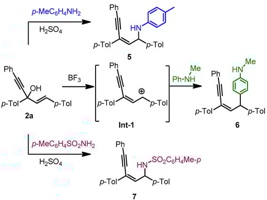 The substitution of 2a with various nitrogen nucleophiles was then investigated, and it appears to be a challenge (Scheme 3). When p-toluidine was used as the nucleophile, the substrate was consumed within a few hours in the presence of 30 mol% of H2SO4, but the desired product 5 was obtained in trace amounts. Interestingly, the use of N-methylaniline as the reagent gave an electrophilic aromatic substitution product, 6. Obviously, the carbocation intermediate int-1 produced via the acid-promoted dissociation of 2a follows the electrophilic substitution with the aromatic ring instead of a combination with the nitrogen donor of N-methylaniline. Finally, the treatment of 2a in a THF solution with p-toluenesulfonamide in the presence of sulfuric acid at 50 °C gave the desired substitution product 7, quantitatively.