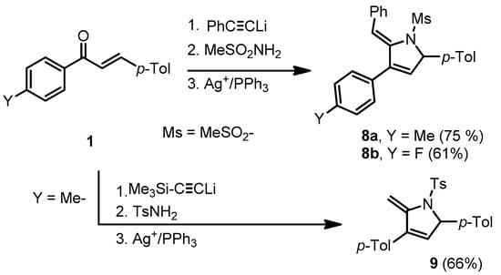 A series of benzylidene-3-pyrrolines were prepared from chalcone derivatives, arylacetylene and sulfonamide via a three-step sequence without the isolation of intermediates. Typically, the reaction of 1,3-di-p-tolylprop-2-en-1-one with lithium phenylacetylide was followed by substitution with tosylamide and then silver-catalyzed 5-exo-dig cyclization to give N-tosyl-2-benzylidene-3,5-di-p-tolyl-2,5-dihydro-1H-pyrrole with a 86% yield. Furthermore, transformation to the corresponding substituted 3-pyrrolin-2-one and pyrrole by m-chloroperbenzoic acid (mcpba)-oxidation and acid-catalyzed aromatization, respectively, was investigated.