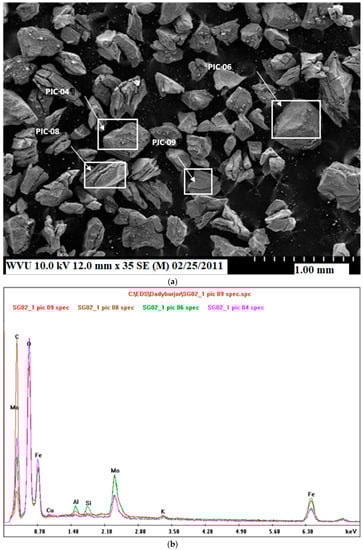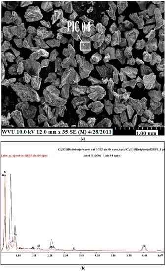(a) Scan at low magnification of the spent baseline catalyst. (b) EDX comparison spectrum for spent baseline catalyst.