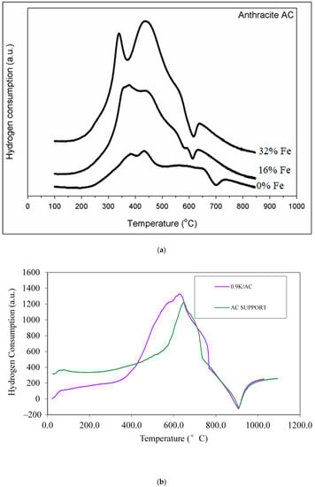 Finally, we note that it is well-known that K catalyzes the high-temperature pyrolysis and the steam gasification of coal, coal-like substances, and carbonaceous matrices. Yet, note that these processes occur at high temperatures—800 °C and above []. This is significantly higher than the temperatures used in this work (around 300 °C), or in commercial FTS. Therefore, it is reasonable to assume that the K impregnated in the anthracite-based AC sample used in this research did not take part in any gasification-type reactions.