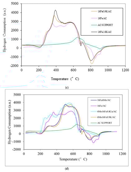 (a) Temperature-programmed reduction (TPR) profiles of the Fe-based catalysts with varying Fe composition (Samples 1–3) supported on AC. (b) TPR profiles of the AC support and 0.9K/AC. (c) TPR profiles of the AC support, 16Fe/AC, 16Fe0.9K/AC, and 16Fe1.8K/AC. (d) TPR profiles of the AC support, 16Fe6Mo/AC, 16Fe/AC, 16Fe6Mo0.8Cu/AC, and 16Fe6Mo0.9K/AC.