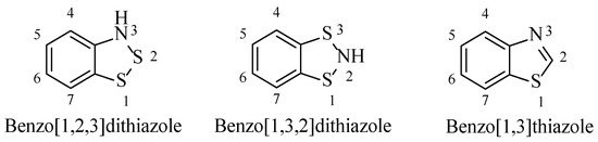 The structure and parent numbering system for benzo[1,2,3]dithiazole, benzo[1,3,2]dithiazole and benzothiazole.