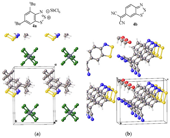 The crystal structures and unit cells of (a) 4,6-di-t-butyl-1,2,3-benzodithiazolium hexachloro-antimony (4a) [8] and (b) 6H-1,2,3-benzodithiazol-6-ylidenemalononitrile tetrahydrofuran solvate (4b) [17].