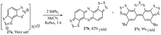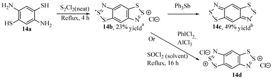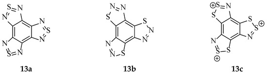 In contrast to this example, a variety of aromatic compounds possessing two dithiazole moieties have been synthesised and characterised, although these have not been generated using the standard Herz reaction conditions [11,15]. Remarkably, there is an account of three[1,2,5]thiadiazole rings bound to benzene (13a, Figure 7) [50,51], as well as the related [1,2,3]thiadiazole (13b, Figure 7) [52]. There remains no evidence of this achievement for the benzotris[1,2,3]dithiazole equivalent (13c, Figure 7).