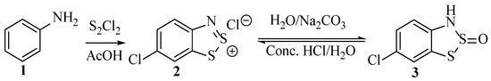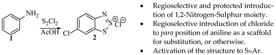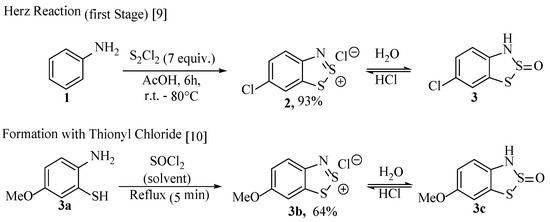 As indicated below (Scheme 2), structures, such as 2 or 3, derive their name from the chemical transformation used in their preparation. Named after its discoverer, Richard Herz, the Herz reaction was first patented [18] in 1913 and published in subsequent journal articles 10 years later, as detailed [19]. It relates to the reaction of various anilines with disulfur dichloride (also known as sulphur monochloride) in a medium of acetic acid to form ‘Herz salts,’ e.g., compound 2 (Scheme 2) [20]. These compounds readily and reversibly react with water to form the sulfone structure 3 (faster in the presence of mild alkaline) and revert to the Herz chloride salt upon treatment with strong HCl [7]. The S-oxide 3 can be further manipulated to produce other structures [21]; the simplest way is to use alkaline hydrolysis, leading to ortho-aminothiophenols, as will be elaborated in detail subsequently [22]. Both the intermediate compounds and the final 2-aminothiophenol hydrolysis products have a variety of uses, but the objective cited by the literature at the time was to make scaffolds for use in the synthesis of dyes [19,23]. The combination and reaction of aniline (1) and sulphur monochloride had been reported in a publication substantially predating (1873—see Section 2.2) that of the Herz reaction [24]; however, the product was only described as a ‘violet-brown dye’ and was not characterised.