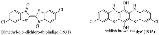 - Herz, R. Verfahren zur Herstellung von Kuepenfarbstoffen. German Patent DE398877C, 29 June 1916. [Google Scholar]