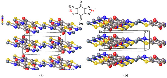 With the exception of the occasional ring-contraction procedure [9], benzodithiazole rings (e.g., 2, 3) are typically formed using the historical Herz reaction or, to a lesser extent, the reaction of a 2-aminothiophenol (e.g., 3a) with thionyl chloride (Scheme 1) [10,11,12]. The first product is the Herz salt, from which other derivatives can be readily generated in simple, single-step transformations, which will be discussed in detail later. Characterisation of benzodithiazole compounds right across the series has proven challenging due to variable stabilities, purification difficulties and often poor solubilities, although all have full characterisation data (the Herz radical, of course, as a solution). Historically the Lewis structures of the first Herz salts and neutral forms were reasoned by derivatisation (reacting to form known entities) but were later characterised by elemental composition analysis, absorbance spectroscopy, mass spectrometry and finally, NMR. Due to the nature of the material, the Herz radicals have been identified by ESR spectroscopy, and some solid Herz compounds and salts have been further studied by XRD. In general, a review of the literature indicates that Herz salts with small monoatomic counterions generate amorphous solids, but well-resolved structures are available with larger counterions such as SbCl6− (4a, Figure 3a) and BF4−. There are written descriptions of benzodithiazole-2-sulfoxides as having ‘crystalline’ forms [7,13,14]; however, a published XRD structure remains unavailable. Instead, there are abundant examples of other solved neutral benzodithiazole structures (e.g., 4b, Figure 3b) [4,8,15]. In these structures, the π-interactions from the benzodithiazole rings are readily apparent from these flat molecules stacking atop one-another.