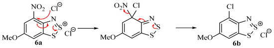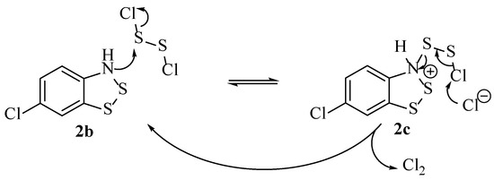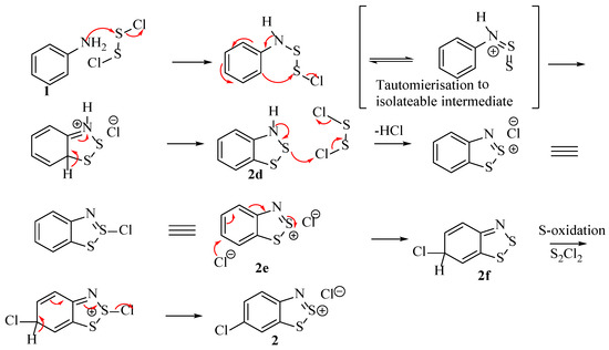 A difficulty in the compilation of this mechanism was the C–Cl bond formation pertaining to compound 2f when the study by Huetis [16] ruled out 2e as an intermediate by trying to react it directly with S2Cl2. Further developments, such as the practical and computation study by Akulin et al. [10], suggest the feasibility that structure 2e could be attacked by a chloride anion at the 6-position as it carries a partial positive charge of 0.14 eV (Figure 5). The reason that 6-chlorination is observed as part of the complete Herz reaction, but not by Huestis when reacting 2e with S2Cl2 is rationalised by the action of the chloride anion that is required for this phenomenon. The amount of free chloride available is only sufficient when generated during the earlier stages of the Herz reaction and not when 2e is mixed with S2Cl2. Another important aspect of consideration is that in some instances, a thiosulfinyl-aniline (Ar-N=S=S) intermediate is reported in the place of the chloro-disulphide [30,31,32]. Instinctively we were not keen on the S=S double bonds, although this functionality has several isolated examples when formed under related conditions. The important aspect is that both intermediates are related by simply the elimination of a Cl− ion and thus will both reach the same ring-closed intermediate (2d) [33].