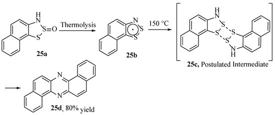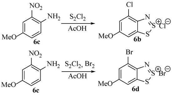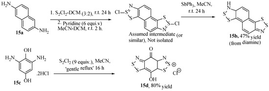 Two unique circumstances where two benzodithiazole moieties (15b or 15d) have formed from an aryl diamine (15a or 15c) using disulfur dichloride [53,54].