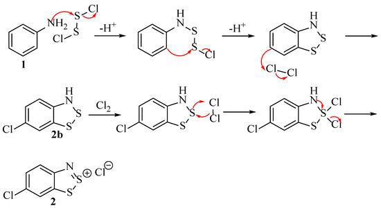 Interestingly, they discovered that free chlorine (Cl2) was present in the reaction and deduced that this was more likely to be the chlorinating agent for the ring, as sulphur monochloride is not sufficiently electrophilic (at the chlorides) to act as a powerful chlorinating agent [22]. They also concluded that the chlorination stage cannot occur after the Herz salt 2 has already formed, as previously suggested by Huetis, because the azathiolium group deactivates the ring towards electrophilic substitution as it is electron deficient. While the chlorination of a vacant para position was still believed to be an electrophilic mechanism, the replacement of other groups by chloride was instead proposed as a nucleophilic substitution, occurring due to the presence and activation by the electron-withdrawing benzodithiazolium. This reasoning represents a significant improvement in comprehension, and it was correct to deduce that S2Cl2 is not the direct source of the chloride, but it was still not understood how the chloride actually originated.