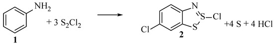 - Claus, A. Einwirkung von Chlorschwefel auf Anilin. Ber. der Dtsch. Chem. Ges. 1870, 3, 527–528. [Google Scholar] [CrossRef] [Green Version]