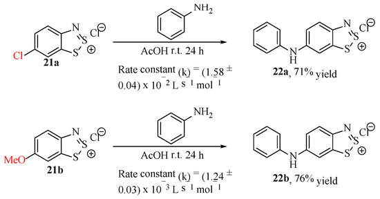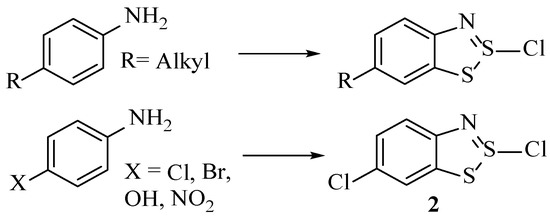 - Hope, P.; Wiles, L.A. The Action of Sulphur Monochloride on Aromatic Primary Amines: The Herz reaction. J. Chem. Soc. C Org. 1967, 1642–1644. [Google Scholar] [CrossRef]