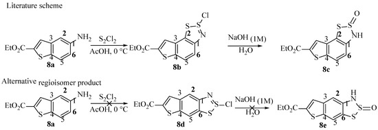 Based upon our proposed mechanism (Scheme 10), the formation of the dithiazole ring involves both electrophilic and nucleophilic ring attacks. The second step is the aromatic C–S bond formation, from one of two possible ortho positions of the starting aniline (1, Scheme 10). In asymmetric anilines, it is inevitable that additional ring substituents will often cause the new 5-membered ring to form from one preferential ortho carbon. Specifically, one would expect the most electron-rich of the two carbons to perform this attack and become part of the new ring. In a publication by Van-Snick et al. [14], this effect is evident in the compounds prepared (Scheme 13), although such high levels of regioselectivity in the product formation is somewhat unexpected. The more reactive carbon is probably C2 because of electron-donating inductive effects from the C3-alykl chain (Scheme 13, 8c). However, C6 is actually similar to C2, so both may therefore be possible, but the paper claims the C–S bond always forms at C2, and the yield is 77%, with no regioisomers reported. There is no explanation as to why the regioselectivity is so high or any record of the other possible product, 8e. Perhaps this other regioisomer was too challenging to isolate or overlooked as a minor product impurity. The compounds were characterised by proton and carbon NMR spectroscopy, along with (accurate) mass spectrometry and IR spectroscopy. Inspecting this data cannot confirm beyond doubt that the proposed regiochemistry is correctly assigned.