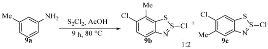 In contrast, the results obtained by Koutentis et al. [40] on substrate 9a instead gave two distinct Herz salts under similar reaction conditions, in a ratio of approximately 2:1 (Scheme 14). The major product is somewhat surprising given the results from Van-Snick, as the carbon that reacts is less activated by the substituents than in the minor product (though the major product could be marginally favoured sterically). The products 9b and 9c (Scheme 14) were not separable but were characterised (from the mixture) and distinguished by proton and carbon NMR spectroscopy, as well as mass spectrometry.
