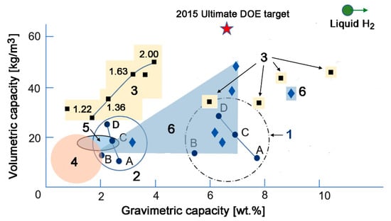 The state diagram of the H2 storage systems employing nanoporous carbon materials. A red asterisk indicates the DOE target value of 6.5 wt.% or 62 kg/m3 (at 233–358 K and 3–100 bar [14,41]). A solid green circle corresponds to the liquid state of hydrogen [2]. The data in circles 1 and 2 correspond to the hydrogen storage in the cylinders made of polymer composite material (circle 1) and fiberglass/aluminum (circle 2) under the pressures: 20 (A), 24.8 (B), 40 (C), and 60 (D) MPa [42,43]. The yellow areas containing black squares (3) indicate the data for physical hydrogen adsorption in carbon nanotubes (square symbols indicate the predicted data for CNTs with diameters of 1.22, 1.36, 1.63, and 2.00 nm [43], as well as experimental results [39,43]). An orange circle (4) corresponds to the hydrogen adsorption in the graphene structures at room temperatures [39]. A light-blue ellipse (5) shows the data on hydrogen adsorption on the industrial activated carbons at room temperatures [44,45]. The light blue areas with rhombs (6) include the data for hydrogen adsorbed in various microporous ACs at 77 K at 5–20 MPa [44,45,46,47,48].